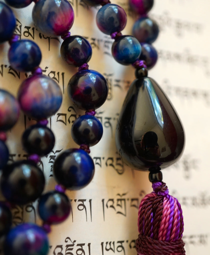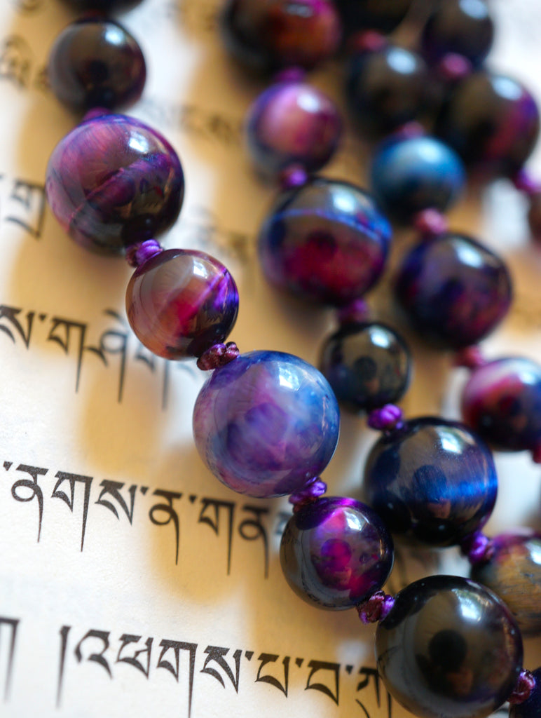 Description: Alternating 8mm and 6mm Rainbow Tiger Eye beads with a 5x25mm teardrop-shaped Onyx guru and variegated purple sutra/tassel. This hand-knotted mala measures 22" from the top bead to the tassel tip.
