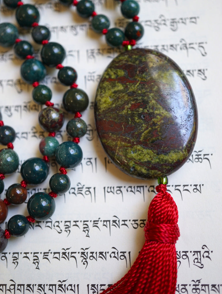 Intention: Embody the mythical dragon's strength, power, and courage with this striking mala design. Both protective and nurturing, Dragon Blood Jasper fosters spiritual growth, creativity, adaptability, and wisdom. Enhance your meditation and spiritual practices with this stunning. one-of-a-kind mala.
