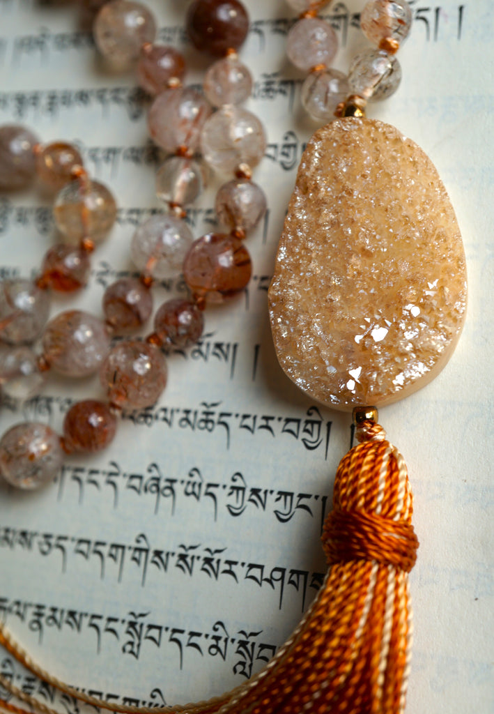 Intention: Celebrate every moment of your personal practice with this beautiful mala design. Rutilated Quartz, also known as the "Stone of Illumination," amplifies clarity, connection, wisdom, spiritual growth, and intuitive insights. Druzy Agate fosters peace, compassion, inner strength, and nurturing, protective energies. Warm and inviting, this mala is ideal for meditation and other contemplative practices.